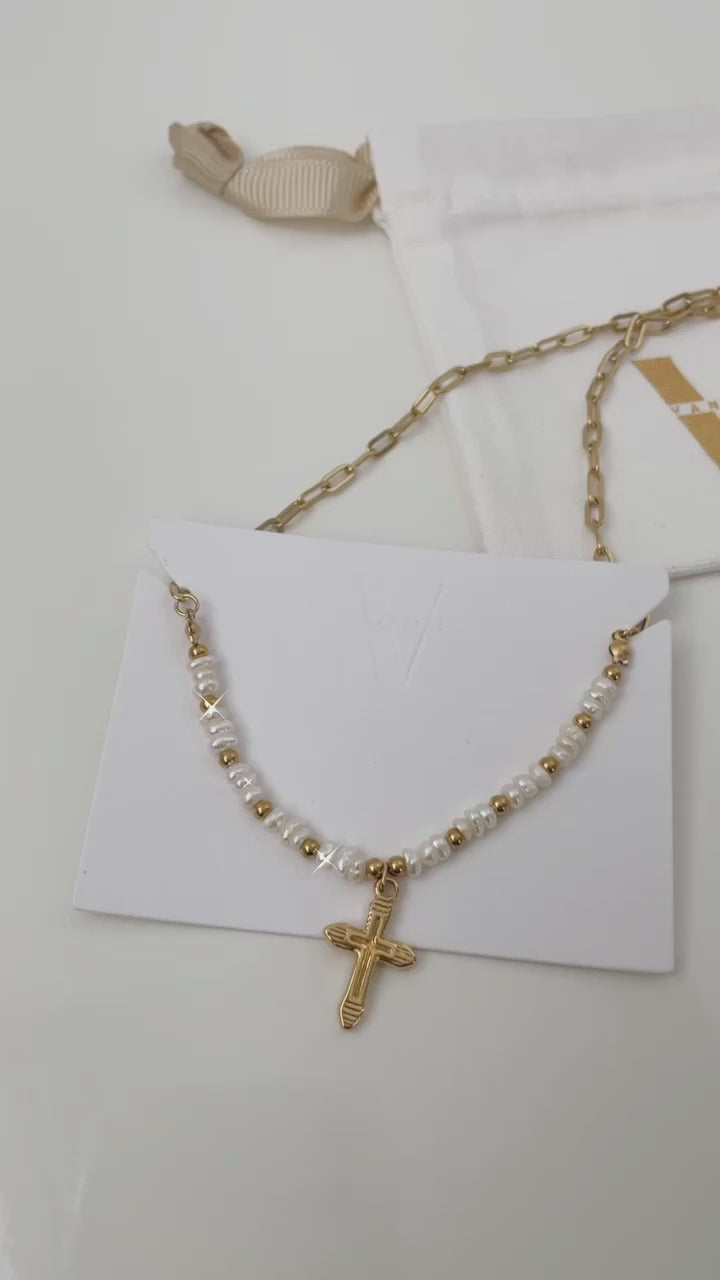 Highlight your style with the Crucecita Necklace , an elegant piece featuring freshwater pearls and a gold cross pendant . Made of stainless steel , it combines delicacy and durability, ideal for everyday wear or as a special gift.