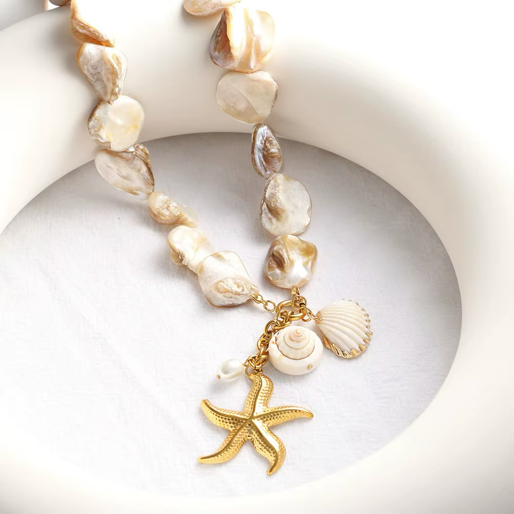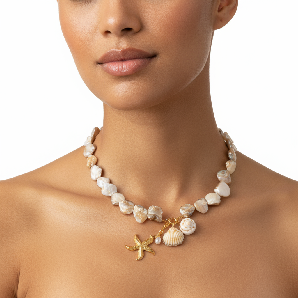 Cada elemento evoca la belleza natural del mar, creando un accesorio versátil que combina sofisticación con un toque bohemio.