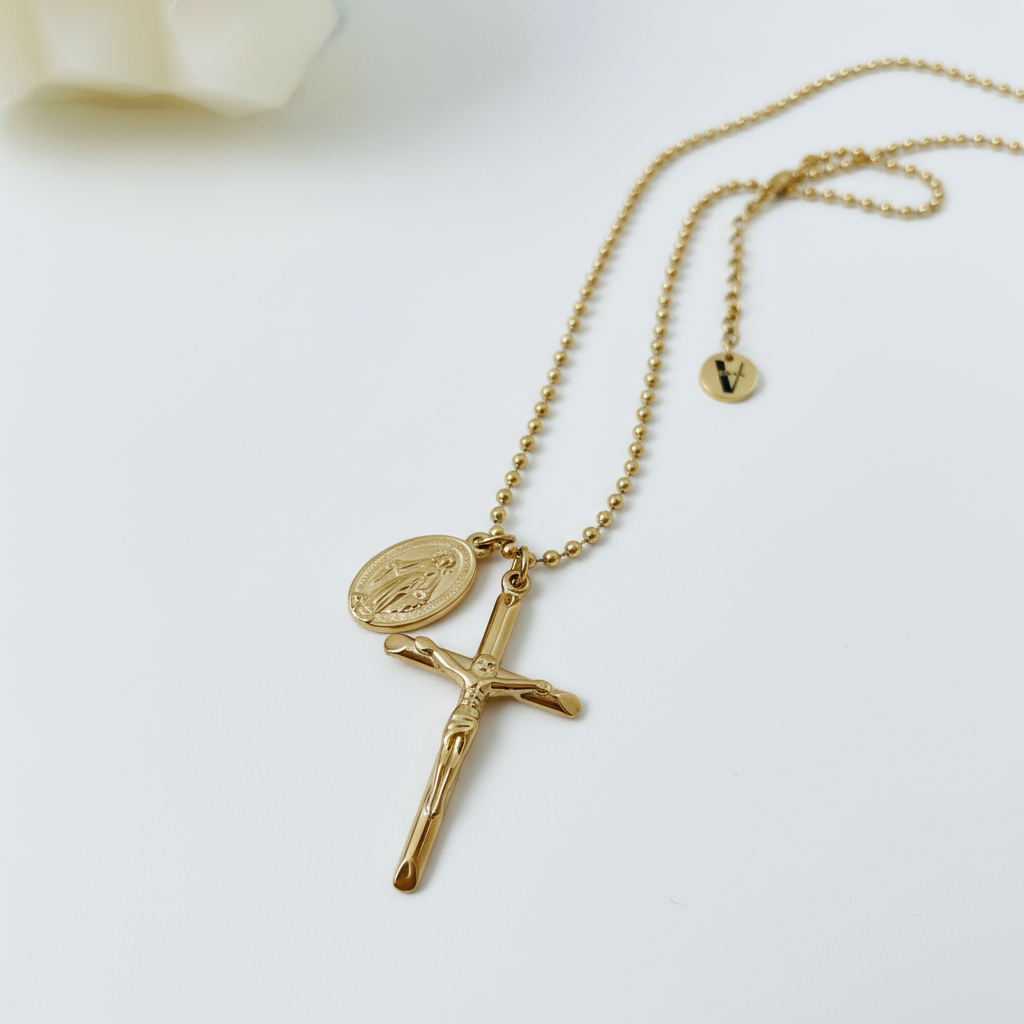 Collar Cruz Dorada con Medallita para Mujer en Acero Inoxidable | Vanytel