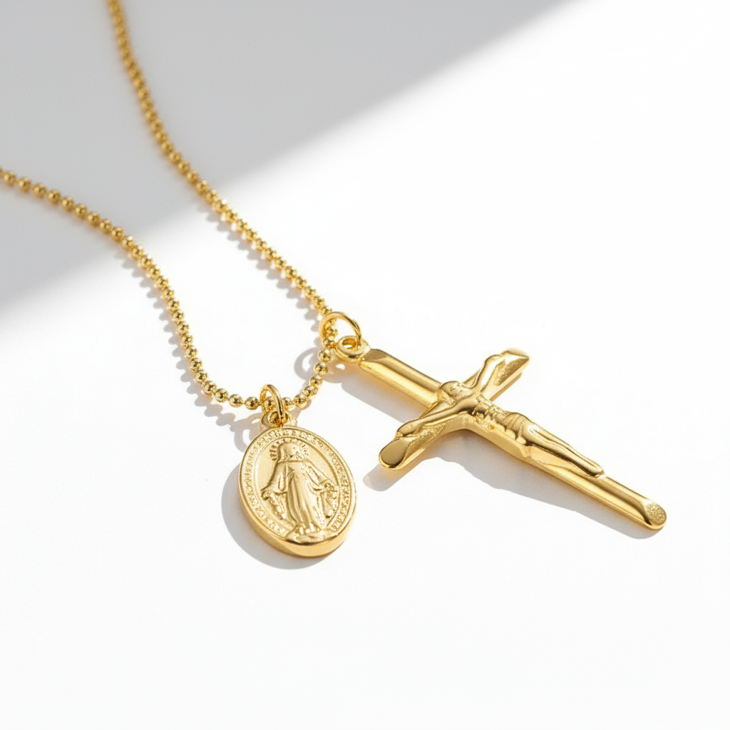 Destaca con el Collar Cruz Dorada con Medallita en Acero Inoxidable, una pieza elegante y significativa que combina estilo moderno con un toque clásico. Diseñado para mujeres que buscan accesorios resistentes al agua, duraderos y con acabado de lujo.
